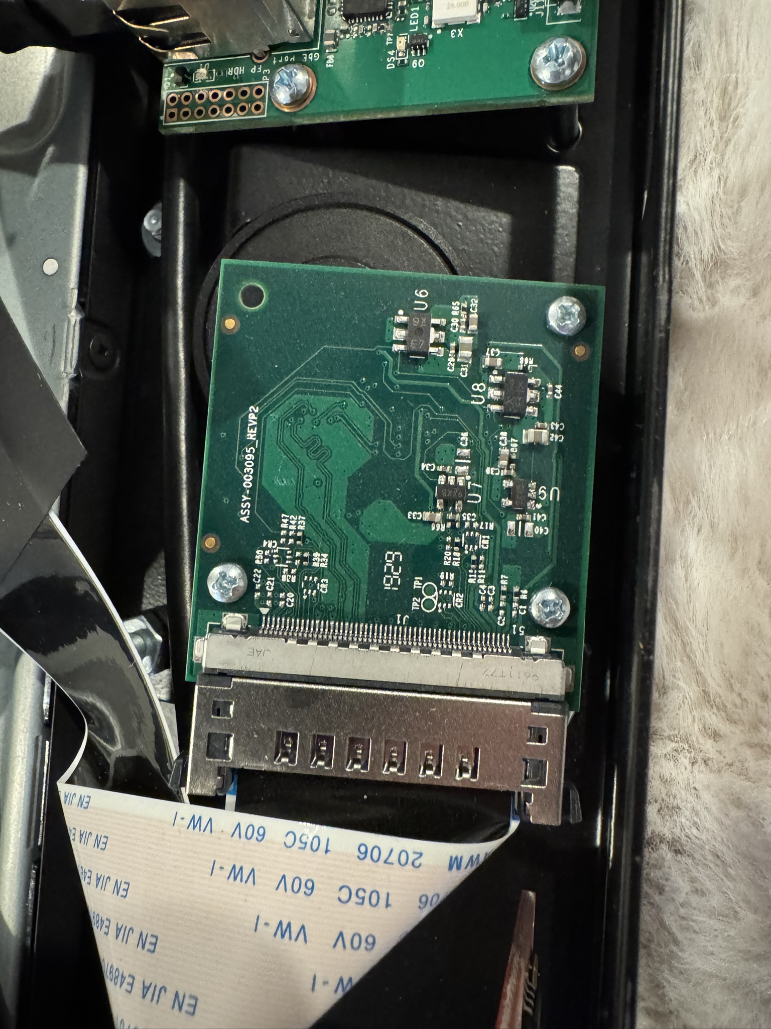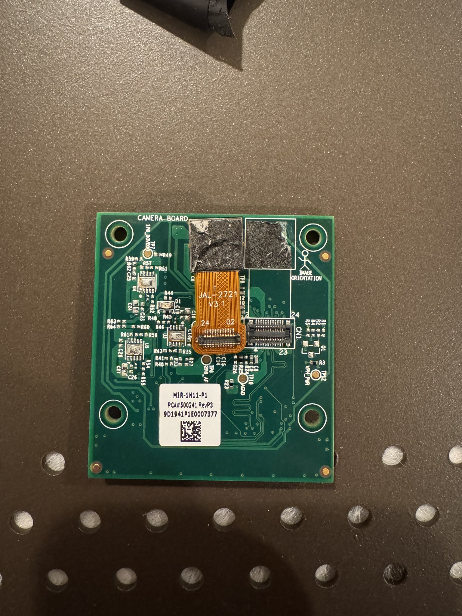 The camera assembly was interesting to pick apart. The camera is an OmniVision OV5640 (JAL-2721 V3.1). It's 5MP with a maximum image resolution of 2592x1944 which drops to 1080p at 30fps. The wide field of view comes from a simple fisheye lens that's mechanically trapped in place. There's no adhesive or active alignment, the lens is dropped into the housing and constrained by the camera module itself.